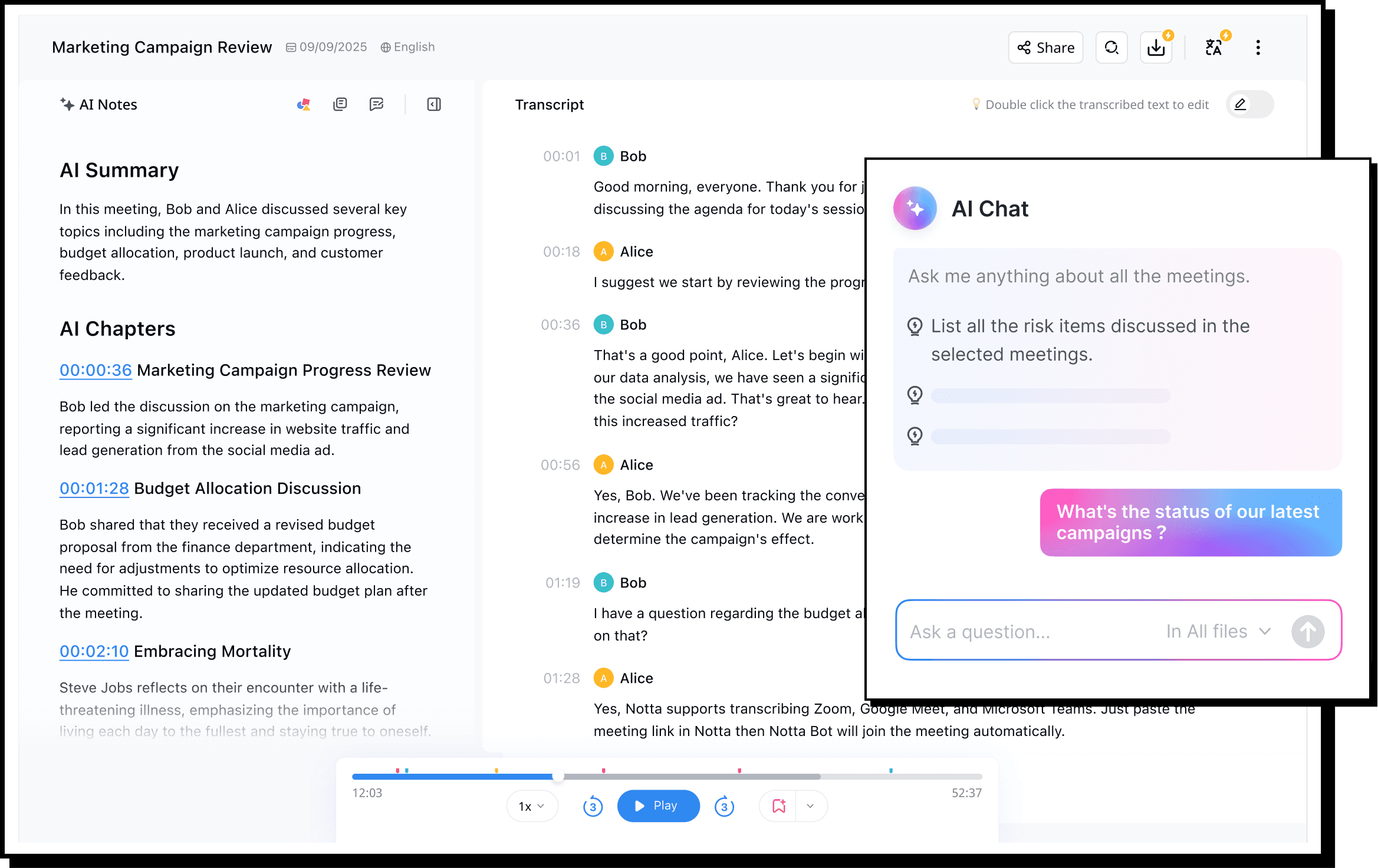 Notta doesn't just transcribe, it understands. AI extracts action items, decisions, and key insights automatically. Generates executive summaries in seconds. Your team gets what they need, when they need it.