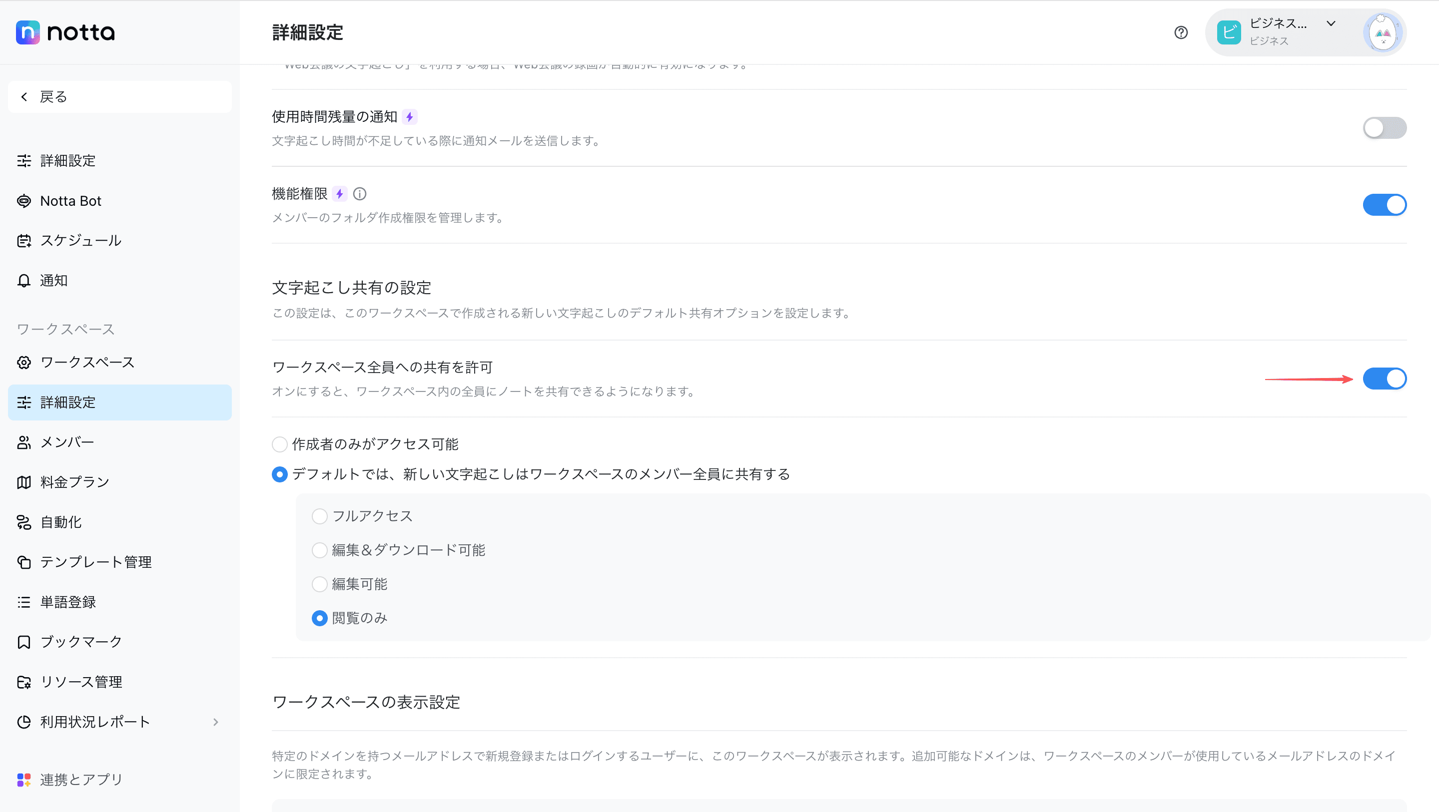 操作手順:「設定」→「ワークスペース・詳細設定」→「文字起こし共有の設定」