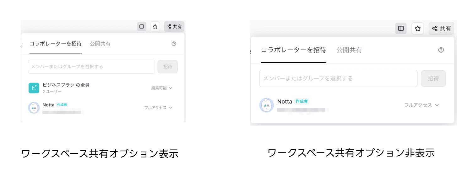 ノート共有時に、ワークスペース全体への共有オプションを非表示に設定できます。これにより、誤操作による情報漏えいを防ぐことができます。