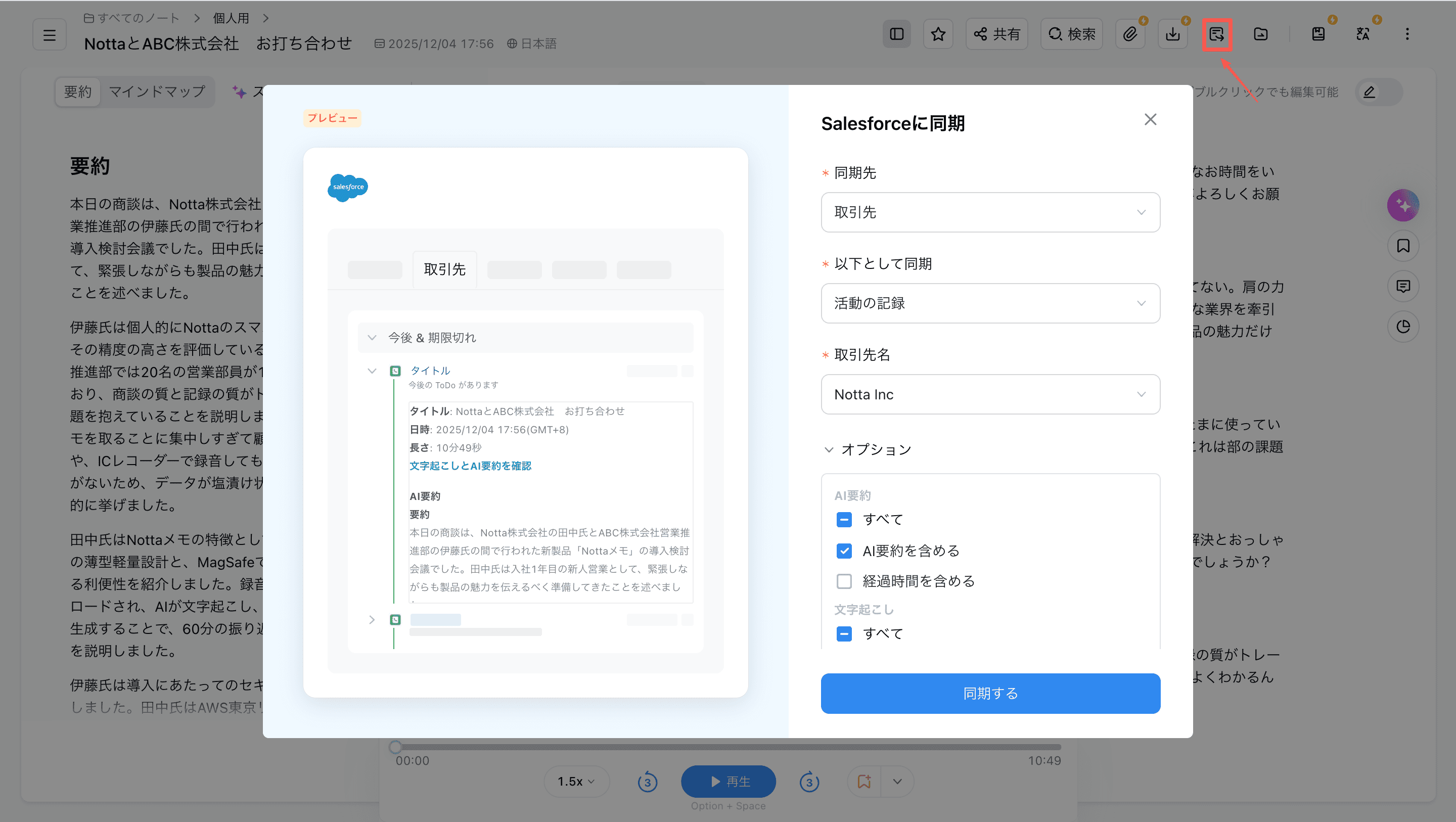 「ノート詳細」→「外部サービスに同期」→「CRMに同期」→「Salesforce」